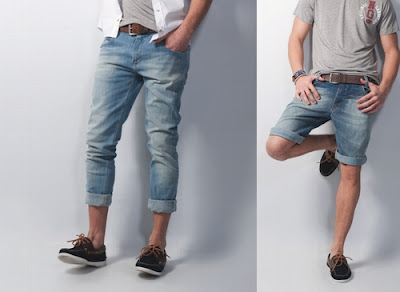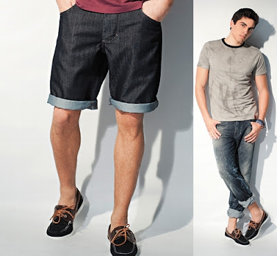 O espírito desta tendência, que voltou com tudo, é combinar tons diferentes de jeans. O diferencial e a modernidade desse look, fica por conta da barra da calça, dobrada em alturas diferentes.