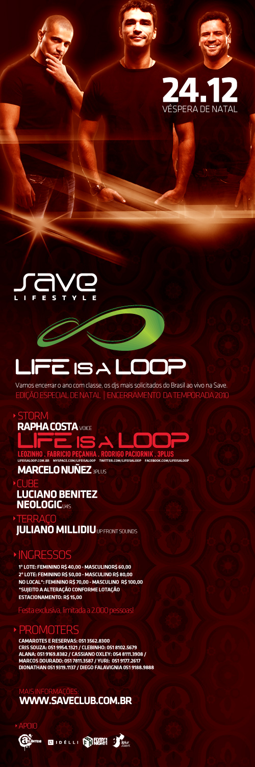 Life is a Loop foi a melhor festa de 2009 e o maior sucesso de público em 2010 na SAVE. Nas duas memoráveis apresentações, o trio botou a baixo a pista Storm, levantando ao delírio a galera durante todo o seu set. Foi contagiante! Incrível! Inesquecível! Faltam adjetivos para explicar o que é uma apresentação do Lial na SAVE! Quem teve a oportunidade de estar presente sabe muito bem disso! E tudo que é bom deixa um gostinho de quero mais... e para encerrar com chave de ouro a temporada 2010 SAVE, o Life is a Loop está de volta, na última apresentação da tour “A Jornada de Lial”.