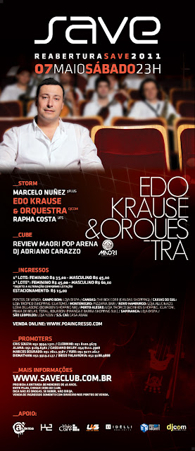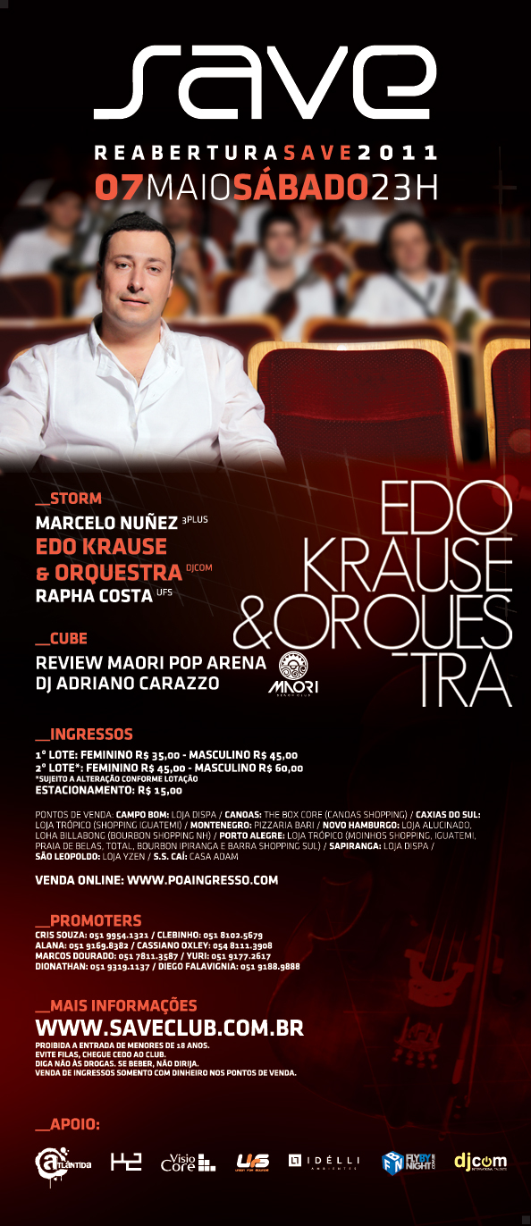 A SAVE inicia a temporada 2011 com força total! Para celebrar esse retorno aguardadíssimo, recebe o projeto Edo Krause & Orquestra. Unindo as batidas da música eletrônica a instrumentos de sopro e cordas, a trupe paranaense constrói seu set de forma intensa, inusitada e exclusiva. Edo Krause & Orquestra promete um show inesquecível. O sentimento de que algo estava faltando na noite gaúcha tem data para acabar! O nosso melhor club está de volta!