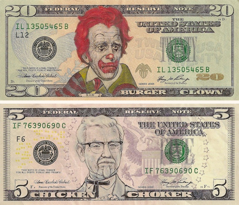 Apesar de ser contra a lei (a desfiguração de dólares é crime nos EUA), o artista James Charles fez uma coleção inteiro desenhada em notas de dólares, intitulada Dinheiro Cultura Pop.