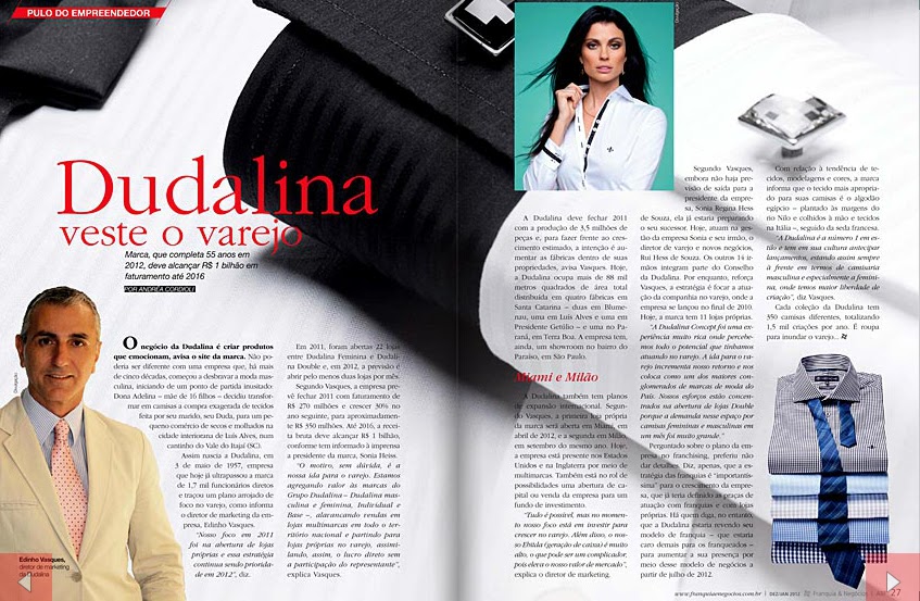 * Perguntado sobre o plano da empresa no franchising, preferiu não dar detalhes. Diz, apenas, que a estratégia das franquias é `importantíssima` para o crescimento da empresa, que já teria definido as praças de atuação com franquias e com lojas próprias. Há quem diga, no entanto, que a Dudalina estaria revendo seu modelo de franquia - que estaria caro demais para os franqueados - para aumentar a sua presença por meio desse modelo de negócios a partir de julho de 2012.